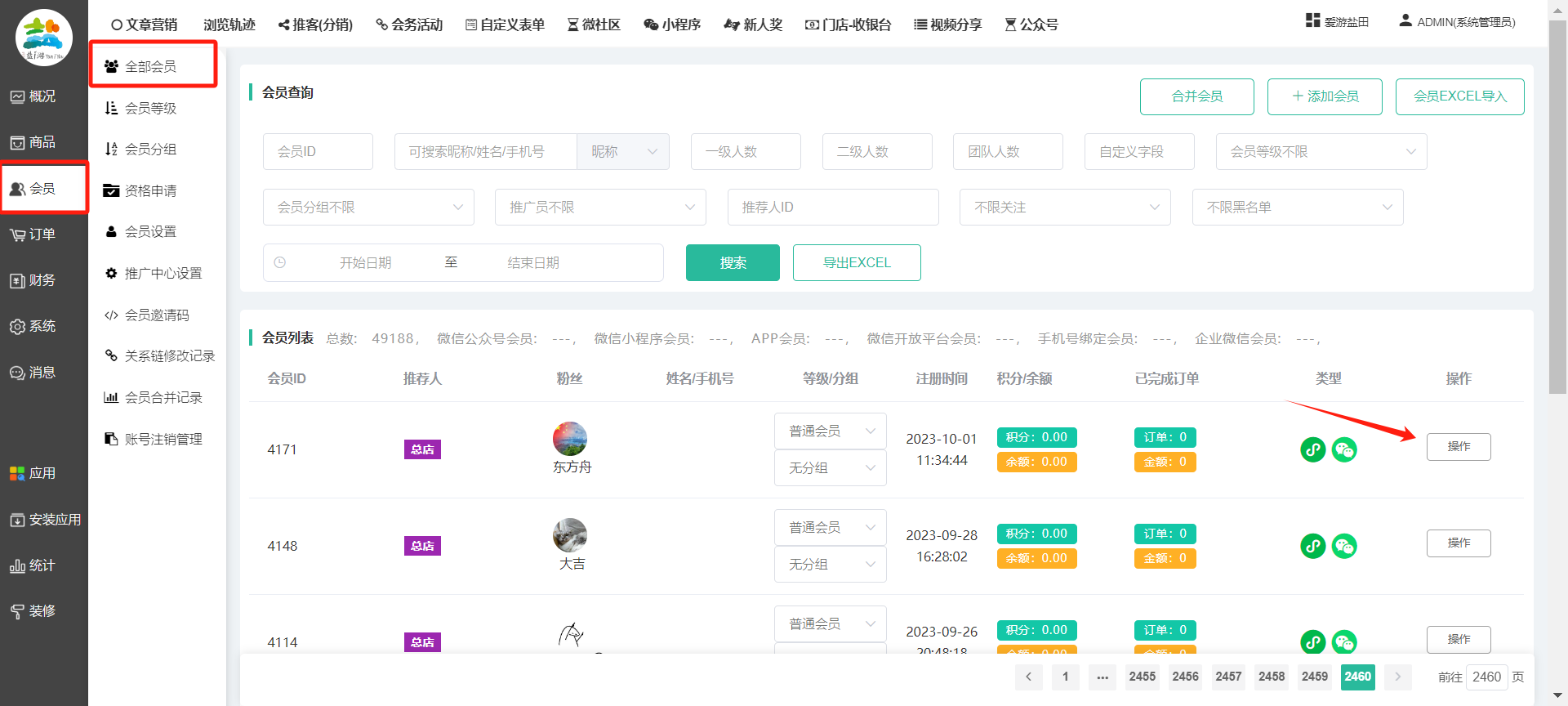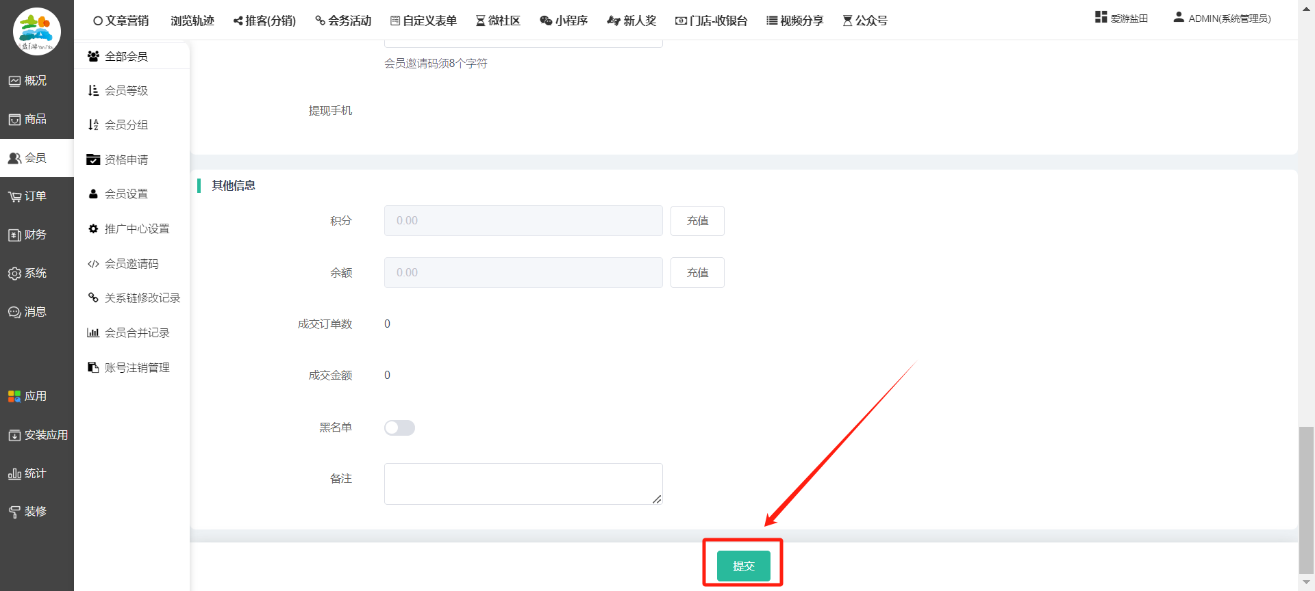 目录 搜索 展开 一、前期准备资料二、数字乡村码-上线操作指南1、服务号的申请流程及认证2、申请小程序流程3、开放平台绑定小程序和公众号三、数字乡村码-系统操作数字乡村码系统管理-概况数字乡村码-商品管理1、发布商品2、商品列表3、商品表单4、商品分类5、品牌管理6、配送模板7、评论管理8、优惠券管理9、商品标签10、退货地址设置11、满额优惠12、批量操作13、配送方式14、基础设置15、商品隐藏四、数字乡村码-会员管理1、全部会员2、会员等级3、会员分组4、资格申请5、会员设置6、推广中心设置7、会员邀请码8、会员关系链修改关系链修改记录9、会员合并记录10、账号注销管理11、会员设置中心五、数字乡村码-订单管理1、订单管理列表2、订单处理流程3、订单状态4、订单修改价格5、订单退款退货6、多包裹发货7、批量发货订单操作步骤8、催发货订单9、物流查询六、数字乡村码-财务管理1、余额设置2、会员余额3、充值记录4、转让记录5、余额明细6、收入明细7、提现设置8、提现统计9、积分管理10、转账审核11、收益广告12、批量充值七、数字乡村码-系统管理1、商城入口2、商城设置①、商城设置②、订单设置③、物流查询④、短信⑤、联系方式⑥、分类⑦、优惠券⑧、分享⑨、幻灯片⑩、广告位⑫、地图设置3、交易设置4、微信模板消息自定义消息模板(新版)自定义消息模板(旧版)小程序消息模板公众号模板消息变更公告5、语言设置6、权限管理7、多媒体管理八、数字乡村码-消息管理九、数字乡村码-应用管理十、数字乡村码系统-数据统计十一、数字乡村码-页面装修DIY1、模板管理2、店铺页面3、顶部导航4、底部导航5、DIY模板市场6、首屏广告7、基础设置8、装修DIY尺寸建议十二、供应商功能插件操作指南1、供应商2、门店-收银台门店申请和使用步骤门店管理①、门店-收银台 营销设置②、门店-收银台 分润设置门店分类门店申请门店审核门店商品门店商品订单收银台订单数据统计核销员基础设置默认设置门店装修3、微社区4、会务活动十三、营销插件操作指南活动报名提货卡新人奖微店问卷调查积分视频分享1、视频分享基础设置2、视频分享发现管理3、视频分享分类管理4、视频分享评论管理5、视频分享分红记录6、视频分享短视频中心每日红包幸运大抽奖签到优惠券二维码任务奖励优惠劵文章音频文章付费文章限时购新海报拓客卡操作流程积分活动素材中心视频红包十四、入驻门店应用类1、门店预约2、附近商品3、门店定位设置4、门店控制5、门店满额包邮6、门店满额减7、导入商品8、门店搜索9、门店股东10、核销券11、多门店核销1、商城后台设置2、前端功能演示十五、常见问题1、后台登录密码修改流程2、会员-余额,积分,后台如何进行充值与扣除3、如何修改上下级关系4、一种万能的获取商城小程序路径的方法 暂无相关搜索结果! 阅读次数:1550 本文档使用 模王系统 发布 8、会员关系链修改 8、会员关系链修改一.如何修改上下级关系?1.会员-全部会员-可以通过搜索用户的独立ID,或者用户微信昵称,找到此会员,然后点击右边的(操作)2.再点击会员详情。3.滑到下面,有个推广信息-会员上线,点击修改4.输入上级的ID号,点击搜索,出来此上级会员后点击选择。5.滑到最下面,一定要点击提交按钮。文档更新时间: 2023-11-30 14:56 作者:链上旅行